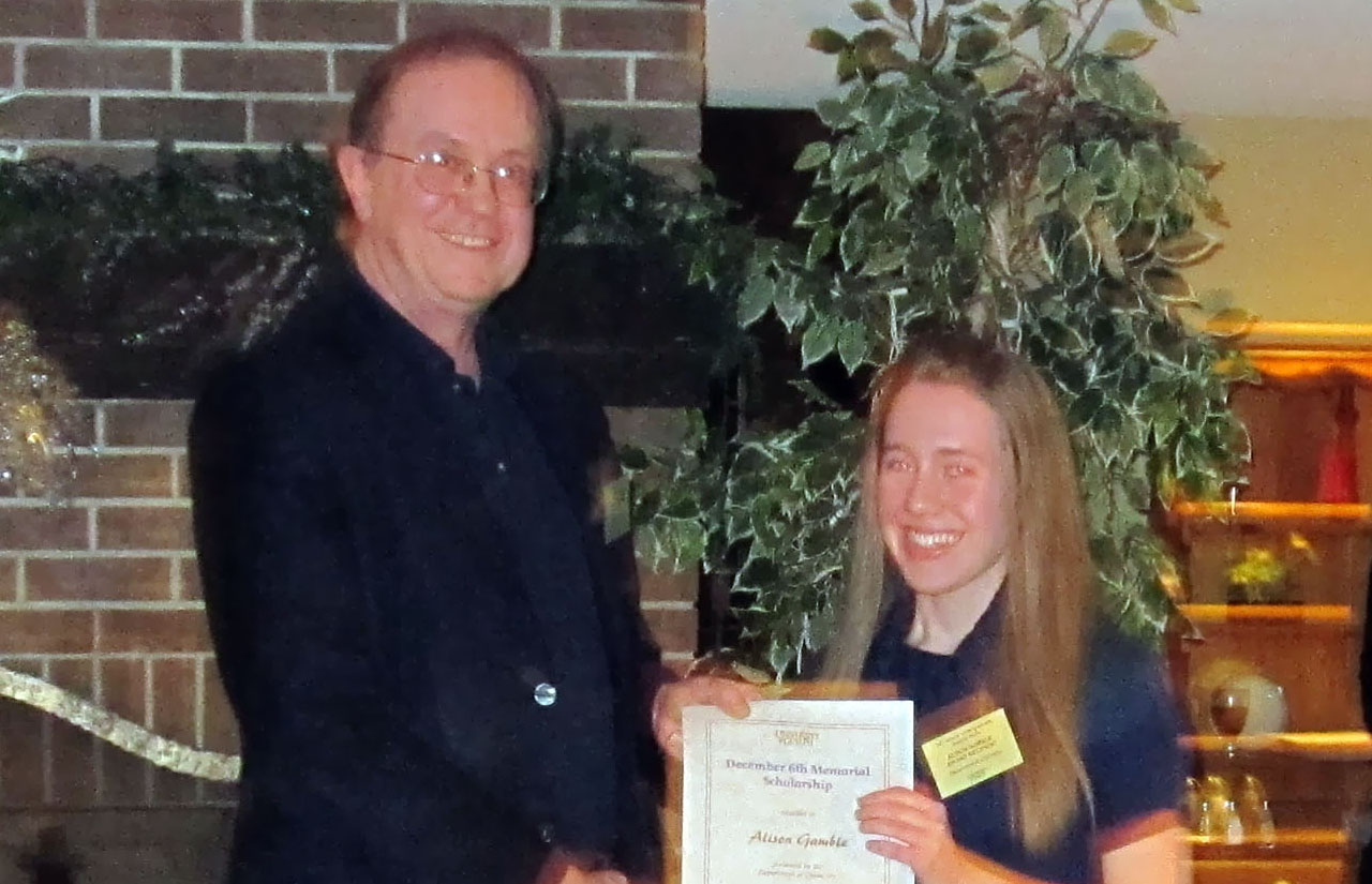 Professor Peter Tremaine presented the December 6th Memorial Scholarship to Alison Gamble |